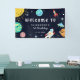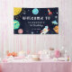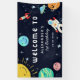 Fun kid's birthday party welcome banner featuring illustration of a galaxy in crayon including an astronaut, U.F.O., planets, stars, rocket. Customise this product by adding your child's name, age, and event date. Perfect for a boy's birthday party.
