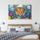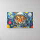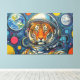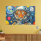 This artwork by Otis Porritt presents a striking tiger's head encased within an astronaut's helmet. Rendered with vibrant, thick impasto-like strokes, the tiger's orange and black fur contrasts sharply with the reflective visor. The surrounding cosmic expanse teems with swirling blues and purples, dotted with luminous planets – including a detailed Earth and Moon – and abstract celestial bodies in vivid hues of yellow, pink, and orange. The bold outlines and dynamic colour palette create a powerful, imaginative fusion of wildlife and space exploration, drawing the viewer into its fantastical universe.