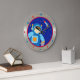 A cute design featuring an astronaut floating in space, outside the spaceship and looking in through the rocket's window. The inside of the spaceship is futuristic with a silvery titanium look, perfect for any space travel design. In the background, you can see the stars filling the galaxy and a rocket flying off across the universe. Colourful numbers are around the border of the clock.