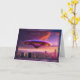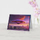 The front of this birthday card features a captivating scene of a sleek, futuristic UFO with glowing purple and orange lights hovering over the New York City skyline at sunset. The sky is painted in vivid shades of purple and pink, creating a dramatic and otherworldly atmosphere. The UFO, with its smooth, circular design and vibrant underbelly, appears almost magical against the twilight backdrop. The iconic Empire State Building can be seen in the distance, adding a touch of familiar urban landscape to the mystical scene. The card is bordered by an ornate black lace-like pattern, adding a whimsical and decorative touch. The phrase "Happy Birthday" is elegantly displayed at the top in matching purple lettering, perfectly complementing the enchanting theme.