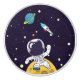 A ceramic knob with a dark blue background with yellow stars scattered around. Layered over top is an illustration of a spaceman wearing a white astronaut suit floating above the moon. Off in the distance is a planet with rings and a rocket ship flying off into the sky looking for new worlds to explore.
