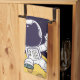A hand towel with a dark blue background with yellow stars scattered around. Layered over top is an illustration of a spaceman wearing a white astronaut suit floating above the moon. Off in the distance is a planet with rings and a rocket ship flying off into the sky looking for new worlds to explore.