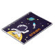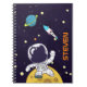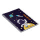 A spiral notebook with a dark blue background with yellow stars scattered around. Layered over top is an illustration of a spaceman wearing a white astronaut suit floating above the moon. Off in the distance is a planet with rings and a rocket ship flying off into the sky looking for new worlds to explore.