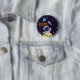 Birthday boy button personalised with a name. Designed with a dark blue background with yellow stars scattered around. Layered over top is an illustration of a spaceman wearing a white astronaut suit floating above the moon. Off in the distance is a planet with rings and a rocket ship flying off into the sky looking for new worlds to explore.