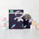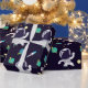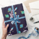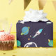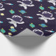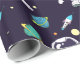 Patterned wrapping paper with a dark blue background with yellow stars scattered around. Layered over top is an illustration of a spaceman wearing a white astronaut suit floating in space. Off in the distance are planets with rings and a rocket ship blasting off to places unknown.