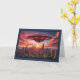 The front of this birthday card showcases an exciting sci-fi scene with a futuristic UFO hovering above the Chicago skyline during a stunning sunset. The sky is ablaze with hues of pink, orange, and purple, creating a dramatic and captivating backdrop. The UFO is prominently featured in the foreground, with glowing pink lights underneath, adding a sense of mystery and adventure. The cityscape of Chicago is bathed in the warm glow of the setting sun, highlighting its iconic buildings, including the Willis Tower. A decorative border frames the image, enhancing the card's overall appeal. The words "Happy Birthday" are elegantly printed at the bottom in gold lettering, completing the adventurous and celebratory feel of the card.