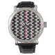 This men's watch has a mid-century modern design of white ovals with red circles connected by white lines on a field of black. Want different colours? Message me.