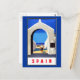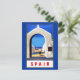 Vintage tourism and travel advertisement illustration for Spain, featuring architecture and a sailboat near the beach. I added thoughtfully designed, colourful graphic borders.
