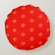 This round pillow is printed with red and orange polka dots on cream and reddish backgrounds respectively