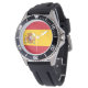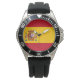 This design features the flag of Spain (known in Spanish as "España"), officially known as the Kingdom of Spain (in Spanish, "Reino de España"), which is a country in Southwestern Europe with some pockets of territory across the Strait of Gibraltar and the Atlantic Ocean. Its continental European territory is situated on the Iberian Peninsula. Moreover, the African enclaves of Ceuta, Melilla and Peñón de Vélez de la Gomera make Spain the only European country to have a physical border with an African country, in this case Morocco. The country's mainland is bordered to the south and east by the Mediterranean Sea except for a small land boundary with Gibraltar; to the north and northeast by France, Andorra, and the Bay of Biscay; and to the west and northwest by Portugal and the Atlantic Ocean respectively. The capital and largest city of Spain is Madrid. Other major cities and towns in Spain include Barcelona, Valencia, Seville (Sevilla), Zaragoza, Málaga, Murcia, Palma, Las Palmas, Bilbao, Alicante, Córdoba, Valladolid, Vigo, Gijón (Xixón), L'Hospitalet de Llobregat, Vitoria-Gasteiz, A Coruña, Elche and Granada.