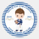 This classic round sticker is in blue, navy and white colours. The sticker is designed with cute, brunette boy holding bible. This Spanish Sailor classic rounds sticker is ideal for boy first holy communion to thank guests. You can keep the wording or change it to your own text by clicking PERSONALIZE option.