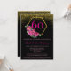 Celebra el 60º cumpleaños de una mujer excepcional con esta Invitación Elegante de Cumpleaños en Español para el 60º Cumpleaños en Negro, Dorado y Rosa. Con un sofisticado fondo negro adornado con un brillante marco dorado en la parte superior, esta invitación emana clase y distinción. En el centro, un hexágono dorado destaca hermosas peonías en acuarela en vibrantes tonos de rosa fuerte y magenta, con el número "60" resaltado en un impactante rosa. Los detalles del evento están elegantemente organizados en una combinación de letras en bloque en rosa claro y fuerte, junto con una caligrafía refinada, todo completamente personalizable para satisfacer tus preferencias.