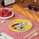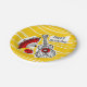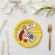 A mid-century style design with a retro touch featuring souvenirs from a Spanish holiday; a wrought iron guitar, lacy fan and red rose on a golden striped background. A customisable design for you to personalise with your own text, images and ideas. An original digital art image created by Jess Perry at QuirkyChic Retro