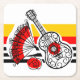 Whimsical design drawn in a retro style featuring souvenirs from a Spanish holiday; a wrought iron guitar, lacy fan and red rose on a striped background. A customisable design in black, white, red and golden yellow for you to personalise with your own text, images and ideas. An original digital art image.