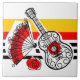 Whimsical design drawn in a retro style featuring souvenirs from a Spanish holiday; a wrought iron guitar, lacy fan and red rose on a striped background. A customisable design in black, white, red and golden yellow for you to personalise with your own text, images and ideas. An original digital art image.