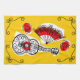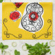 Whimsical design drawn in a retro style featuring souvenirs from a Spanish holiday; a wrought iron guitar, lacy fan and red rose. A customisable design in black, white, red and golden yellow for you to personalise with your own text, images and ideas. An original digital art image.