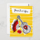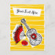 Whimsical design drawn in a retro style featuring souvenirs from a Spanish holiday; a wrought iron guitar, lacy fan and red rose. A customisable design in black, white, red and golden yellow for you to personalise with your own text, images and ideas. An original digital art image.