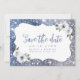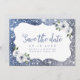 Faux sparkle silver and blue glitter frame and "save the date" script with dusty blue and white floral, elegant and stylish. Great save the date card for modern wedding, romantic wedding, and botanical garden wedding.