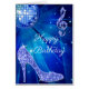 Women's elegant birthday greeting card with glitz and glamour. Woman's beautiful blue and white greeting cards with a funky retro disco mirror ball, glamourous printed image rhinestones, glitter, sequins, bling jewels sparkle high heels stilettos shoes, and glittery musical notes / music notes with sparkles on a vibrant blue lights and sparkles background. Chic, classy, cute, girly, modern cards for women and girl's in trendy, fashionable colours. These groovy, fancy, stylish, sophisticated, pretty, girly cards.. PLEASE NOTE: All products on Zazzle have flat printed images. If you need any assistance customising your product please contact me through my store and I will be happy to help.