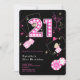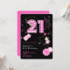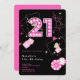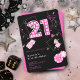 The invitation prominently displays "21" in a large, eye-catching, light-up marquee-style font, immediately establishing the celebratory tone and the significance of the 21st birthday. A sparkling glitter graphic surrounds the "21," adding a touch of glamour and festivity. The hot pink and black colour scheme creates a bold and energetic contrast, making it perfect for a woman who loves to stand out. The casino theme is reinforced with illustrations of playing cards, dice, chips, and a cocktail glass with cherries, suggesting a fun and playful atmosphere.