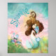 Lovely mermaid with flowing brown hair and sparkling scales of blue, seems to send out shimmering golden light from within. The little fish friends watch in wonder on the ocean bottom.