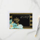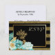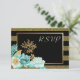 This elegant RSVP card combines modern and chic with the traditional wedding floral. It features a stunning image of mint and white coloured flowers with gold embellishment at the bottom. The image is laid over a shiny gold frame. Your custom text is in light gold at the right. All is placed on a dramatic black and faux glitter gold stripe background. The back of the card is solid white to make it easy for your respondent to mark. Elegant, trendy, and appropriate for weddings in any season! * Please note - the background is printed on the card, and contains no actual glitter.