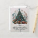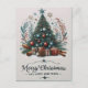 A festive Christmas card featuring a colourful Christmas tree adorned with ornaments and twinkling lights, surrounded by beautifully wrapped presents.