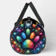 This unique duffle bag features a dazzling colourful pattern of sparkling cosmic elements, including abstract vibrant shapes and stardust on a dark background. It's a stylish and versatile travel gear piece, ideal for everyday use as an organiser.