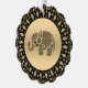 An elegant gold sparkling circle frame with a black floral paisley elephant.