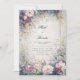 Transport your guests to a realm of moonlit magic with this breathtaking botanical masterpiece. The composition features a lush array of purple bloom, lavender petal, and soft pink blossom clusters, intricately woven with shimmering gold sprig and leaf motifs. A double-line gold frame borders a misty, ethereal cream center that sparkles with glowing stardust bokeh, while the edges transition into a deep, moody indigo watercolor texture. This wedding invitation is a premier choice for a celestial evening ceremony, a romantic spring garden event, or an opulent fairytale gala. It ensures your celebration is introduced with a sense of high-end artistic drama and natural grace from the moment the envelope is opened.