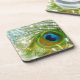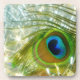 Glamourous holiday coaster with beautiful peacock feather, shiny silver tinsel and sparkling lights