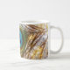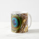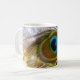 Glamourous holiday mug with beautiful peacock feather, silver tinsel and sparkling Christmas lights