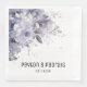 A sparkling silver and mauve wedding napkin featuring a watercolor floral of mauve peonies and silver grey eucalyptus greenery with splashes and splatters of silver ink dots with your names and details in a modern san serif font.