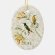 Two green hummingbirds, one with a blue throat and the other with a bright yellow chest, rest on a yellow orange trumpet vine, on a light gold marble texture background. Personalisation options on front and back, or remove text for an elegant nature-inspired addition to any Christmas tree. Perfect all occasion gift for hummingbird lovers.