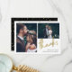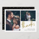 This modern wedding thank you card features two of your personal photos, with faux gold sprinkles and the word "thanks" in trendy faux gold handwritten script. The back of the card is a dark black background with a faux gold look abstract dot pattern.