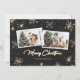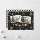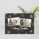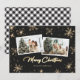 Beautiful double sided black and white buffalo plaid photo Christmas card featuring sparkly snowflakes and stars with a gold calligraphy title and two photos. A black and white buffalo plaid background at the back.