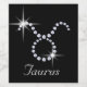 Sparkly glam wine bottle label features the zodiac / astrological symbol for Taurus in diamond rhinestones on black background. Taurus is assigned to those born April 21 until May 20
