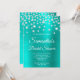 The background features a faux bright turquoise satin style ombre foil background with faux sparkly diamond rhinestone confetti glam.