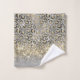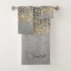 On this stylish towel set is a silver metallic sheen on the bottom of the large towel where you can personalise it then a glittery gold pattern that blends into a glittery leopard print with a silver backdrop for extra pop. Can be personalised on the bottom large towel. Glam chic vibes.