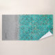 On this stylish towel set is a silver metallic sheen on the bottom of the large towel where you can personalise it then a glittery silver pattern that blends into a glittery silver leopard print with a turquoise backdrop for extra pop. Glam chic vibes.