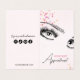 The design combines business card functionality with appointment card and is a lavish blend of glam and minimalist aesthetics, featuring a blush pink gradient background that exudes luxury. It features a confetti like, multicolor sparkly stars glitter, giving it a girly and festive touch. The central black illustrations of lash extensions emphasise the theme of beauty and elegance. Custom name and profession is elegantly scripted in burgundy purple, resonating with makeup artists, brow bar professionals, beauty salon owners, lash extension specialists and esthetitians. The card has provisions for a custom QR code and personalised social media icons and your company address offering a seamless blend of functionality and style. Glitter elements lend a subtle shimmer, enhancing the card's upscale, lash bar vibe, while keeping the overall look clean and uncluttered.