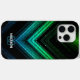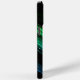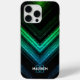 Sparkly metal neon aqua green galaxy chevron Monogram iPhone 15 Case. Personalise with your initial and name. Abstract sparkly metallic black green and blue galaxy stripes lines digital design. No actual sparkles!