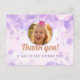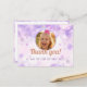 Express gratitude after a magical birthday celebration with this thank you postcard! Featuring a beautiful personalized photo of your child, surrounded by dreamy purple watercolor bubbles and shimmering silver stars. This whimsical design is perfect for a girl's birthday party, making guests feel appreciated for their presence and gifts. Easily customize with your own photo and message to create a memorable keepsake. A truly special way to say 'thank you' for the best birthday ever!