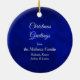 Glittery silver swirls are used in this design to make a pretty Christmas tree image. The image is placed on a vivid royal blue gradient background. The back of the ornament has the same blue background, with four text fields in silver for you to customize. Makes a nice gift from the family.