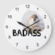 Photo of a small but rather aggressively looking at you sparrow and a text Badass. This is really a troublemaker. Funny wall clock.