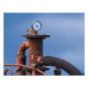 Sparrow sitting behind meter and on top of a red and rusty old machine used for checking air pressure on early evening.