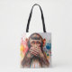 This simian tote bag features a vibrant watercolor painting of a cute monkey covering its mouth in the "speak no evil" gesture.