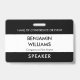 Streamline your event experience with this sleek speaker name badge featuring a clean black-and-white design and a functional double-sided layout. The front clearly displays attendee details, while the back includes a convenient event schedule and QR code for quick access to important information. Perfect for conferences and trade shows, this badge combines professionalism with practical usability.