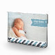 Add your favourite landscape orientated newborn photo to this modern acrylic photo block for a unique way to remember and display your baby's arrival. Design features your baby boy's name, birthdate and birth stats on a sky blue ribbon banner, with a bottom border of diagonal stripes in white, navy and sky.