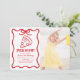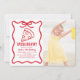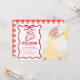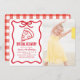 This cute "special delivery" kid's birthday photo invitation features hand-drawn illustrations of a bow and slice of pizza surrounded by a red wavy frame. The reverse side features a white background with a red gingham plaid. Personalize it for your needs. You can find matching products at my store.